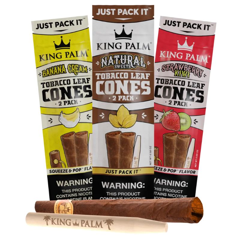 King Palm presents real leaf cones for the tobacco connoisseur. Skip the rolling process and Just Pack It using the packing stick for ultimate convenience. Hand-rolled to perfection with a sturdy paper tip allowing superior airflow. This balanced Broadleaf was dark air-cured to create a naturally bold and rustic taste of luxury. Carefully grown and selected by generational farmers, free of additives and preservatives.