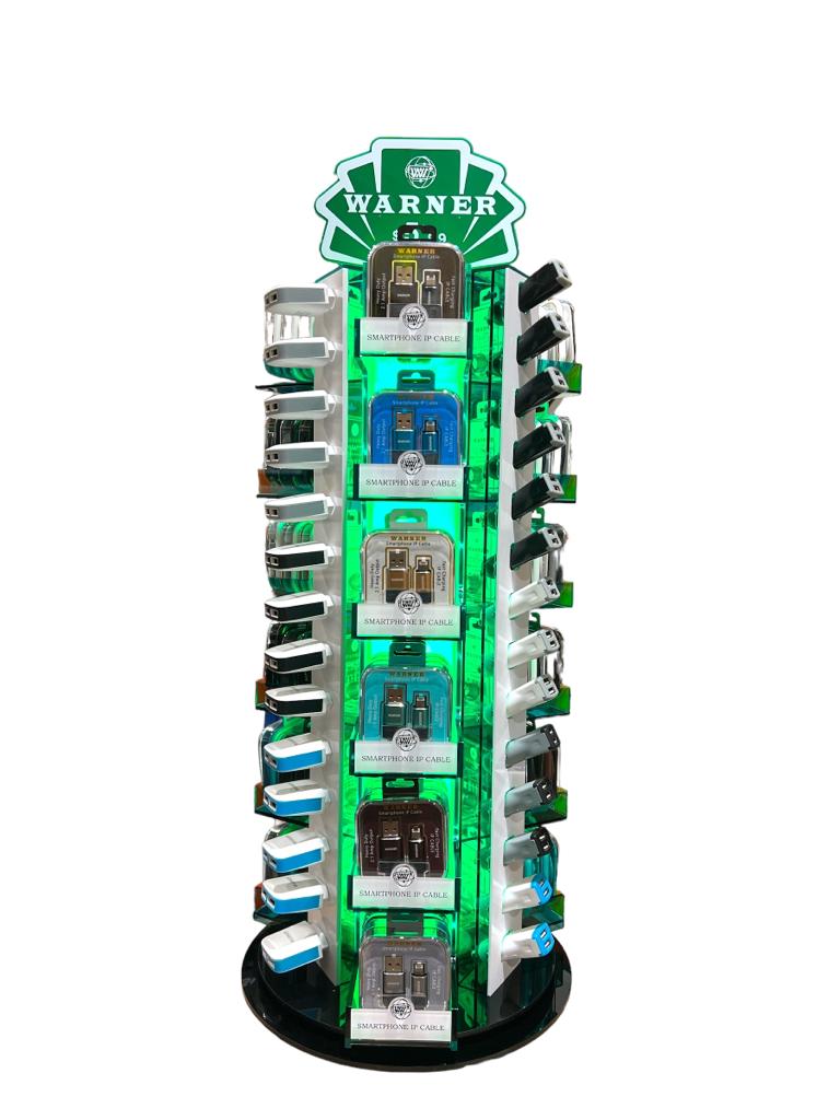Warner Display (007) 114ct | Car Charger Adapter x 28 | USB Wall Adapter x 14 | Audio Cable x 8 | Earphone x 16 | IP Cable x 24 | Type C Cable x 24